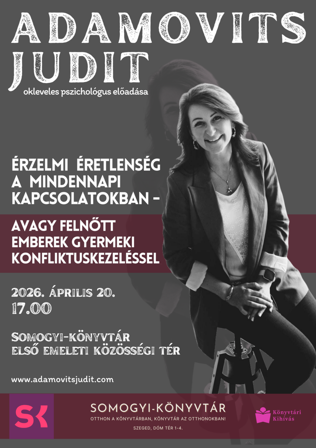 Az előadás címe: Érzelmi éretlenség a mindennapi kapcsolatokban – Avagy felnőtt emberek gyermeki konfliktuskezeléssel – 2026. április 20., hétfő 17.00