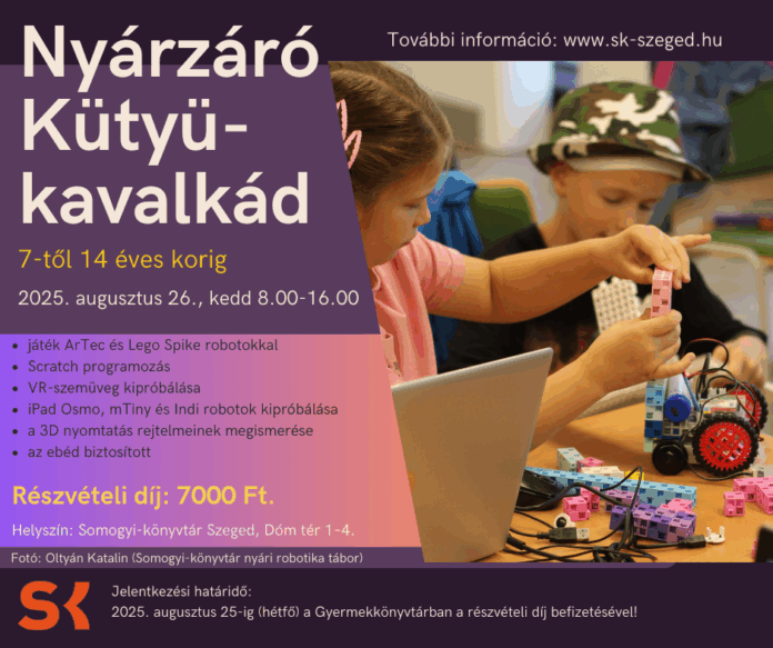 2025. augusztus 26., kedd – Ez a nap csak rólad szól! Egész nap játszhatsz a Somogyi-könyvtár ArTec és Lego Spike robotaival, megismerkedhetsz a Scratch programozással, kipróbálhatod a VR-szemüveget, iPad Osmot, mTiny és Indi robotokat, valamint megnézheted, hogy készülnek a 3D tárgyak. Jelentkezés 2025. augusztus 25-ig a Gyermekkönyvtárban, a részvételi díj befizetésével!