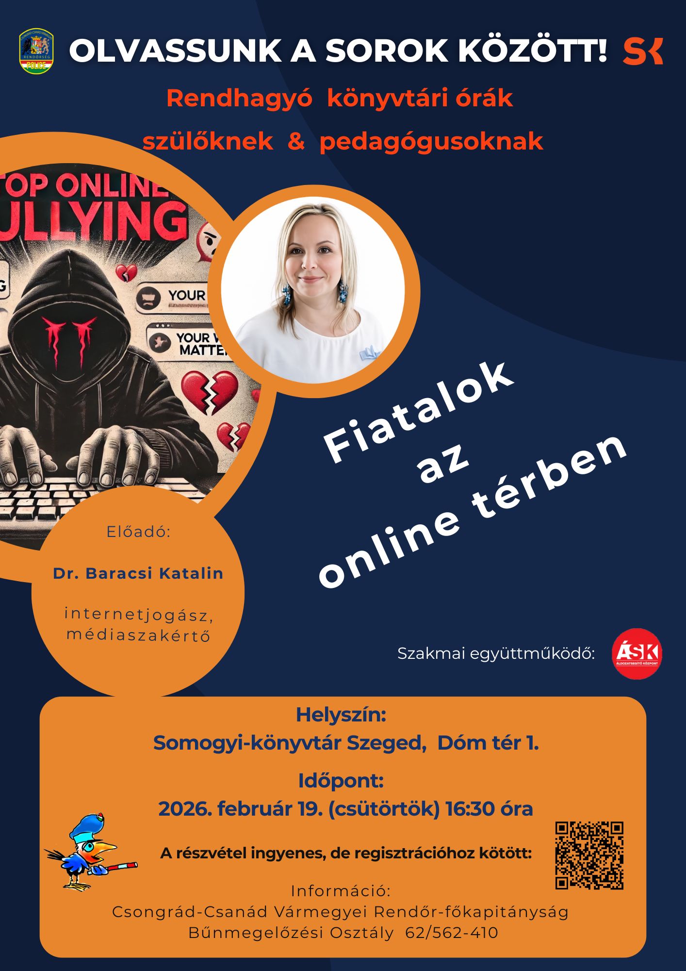 A Csongrád-Csanád Vármegyei Rendőr-főkapitányság és a szegedi Somogyi Károly Városi és Megyei Könyvtár „Olvassunk a sorok között! – rendhagyó könyvtári órák szülőknek és pedagógusoknak” címmel közös új bűnmegelőzési program-sorozattal várja az érdeklődőket.