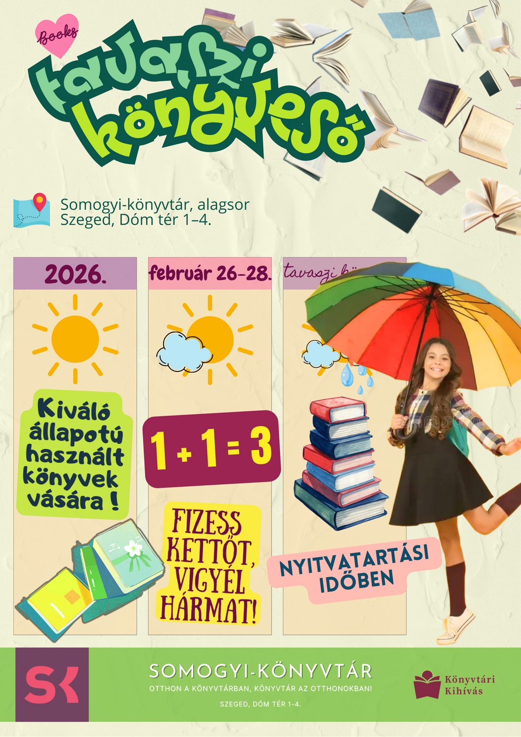 Egy jó könyvért megéri elázni, de háromért még inkább. Válogass te is a TAVASZI KÖNYVESŐ használt könyves kínálatából február 26. és 28. között, és mi minden harmadik könyvet ingyen adunk. A könyvek kedvezményesen 200-500 forintért megvásárolhatók.