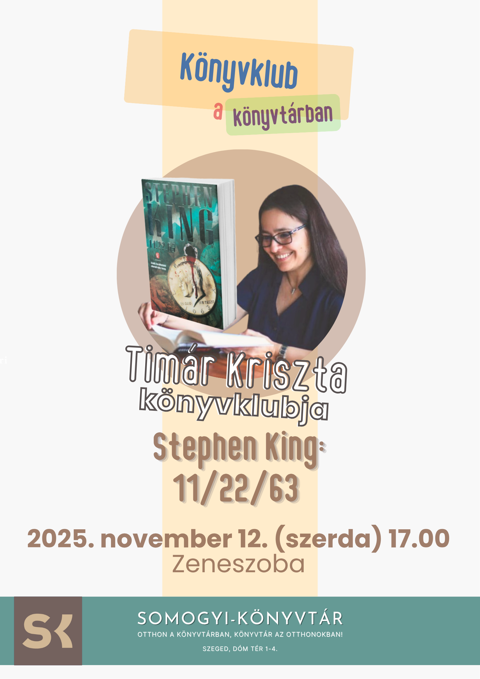 A könyvklub novemberi összejövetelén az olvasmány Stephen King 11/22/63 című regénye, amely „nem pusztán zseniális időutazás és páratlanul izgalmas, váratlan fordulatokban gazdag történet, hanem a véletlenről, a választásainktól és a sorsról szóló tűnődés is. Letehetetlen.”