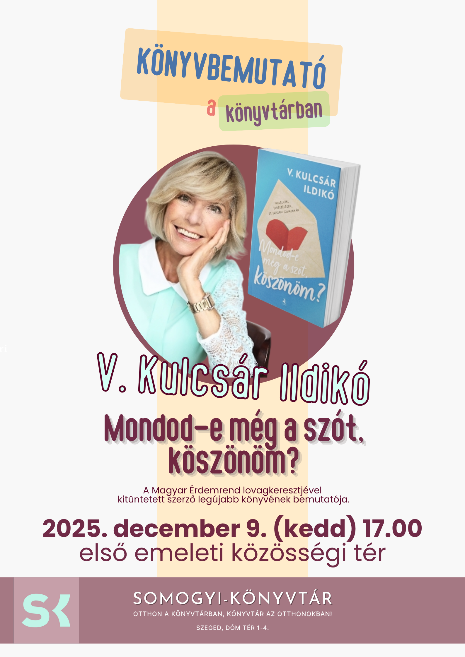Idén látott napvilágot V. Kulcsár Ildikó, a Nők Lapja legendás újságírójának tizennegyedik könyve. A gazdag életmű legújabb darabjából megtudhatjuk, milyen egy „pénzzel bélelt pokol”, hogyan torzít „a hazugság békés pocsolyája” és mi lesz a szeretetlenségtől szenvedő gyerekekkel. A világ egyre komorabb, amit a különösen érzékeny író-újságíró jól ismer. De mert örök optimista, nem nyugszik bele! A köszönetet, a hálát, a szeretetet, a legszebb emberi érzéseket állítja szembe a fokozódó érzéketlenséggel. Mert úgy hiszi, csak ezek tarthatják elviselhető melegben a lelkeket és e szegény világot.V. Kulcsár Ildikót 2009-ben a Magyar Érdemrend lovagkeresztjével tüntették ki.