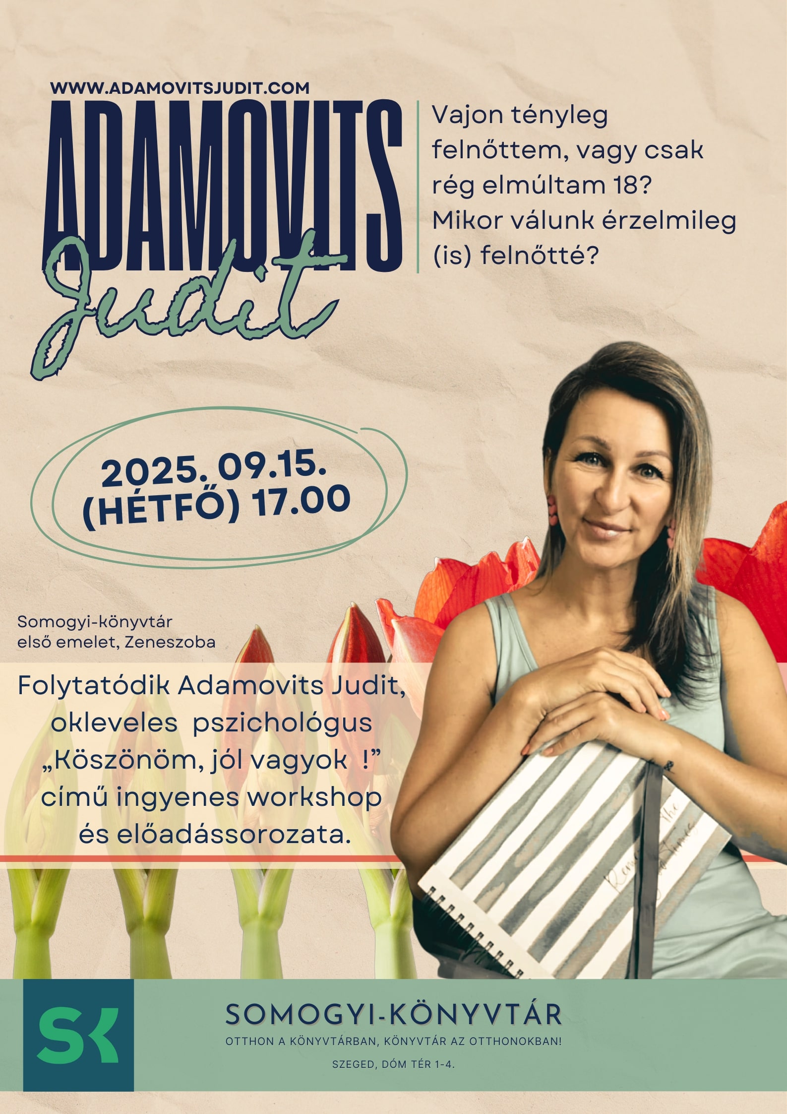 Adamovits Judit okleveles pszichológus „Köszönöm, jól vagyok!” című ingyenes workshop és előadássorozata