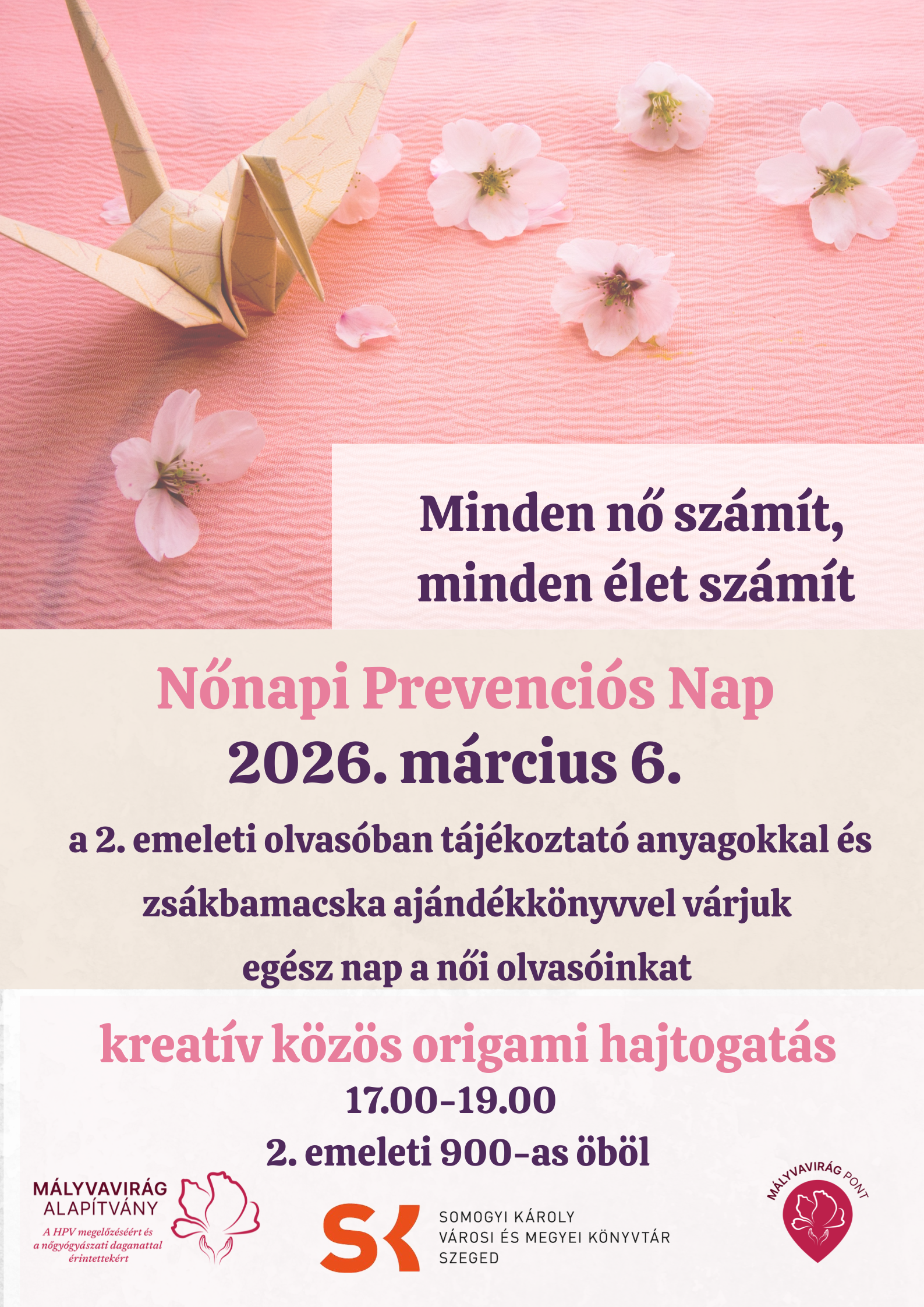 Hagyományainknak megfelelően Nőnapi programunkkal ismét a prevenciót ötvözzük az olvasásnépszerűsítéssel. Azok a hölgyek, akik a 2. emeleti Központi Kölcsönzőben 2026. március 6-án (péntek) kitöltenek egy pár perces villámfeladatot, és a MályvaPolcról, a Mályvavirág Alapítvány információs szóróanyagaiból választanak néhányat, azonnali értékes könyvet kapnak ajándékba!