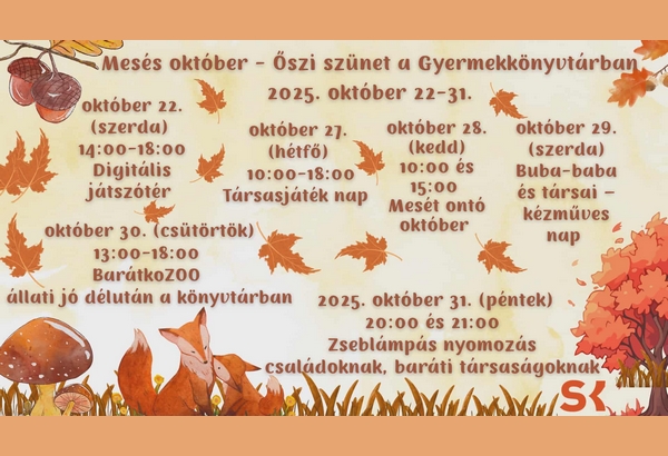 Hírek Mesés október 2025. október 19. FacebookTwitterPinterestEmailPrint Őszi szünet a Gyermekkönyvtárban – 2025. október 22-31.